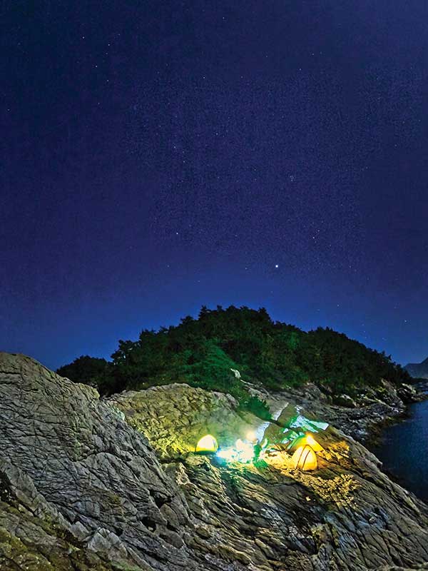 장도항에 내려 마을을 바라보았다. 너덧 채의 집 뒤로 울창한 숲이 보였다. 아니 거대한 칡넝쿨에 잠식당한 숲이라고 하는 게 맞겠다. 가까이 가보니, 넝쿨 안에는 대나무와 동백나무가 있었다. 우거진 넝쿨을 지나 해변을 따라 이어진 좁다란 길로 들어갔다. 10분 남짓 걸어 들어가자 널찍한 갯바위가 나왔다. 생각했던 것보다 좋은 야영지였다. 낚시가 안 돼도 하룻밤을 보내기에 충분히 아늑한 장소였다.