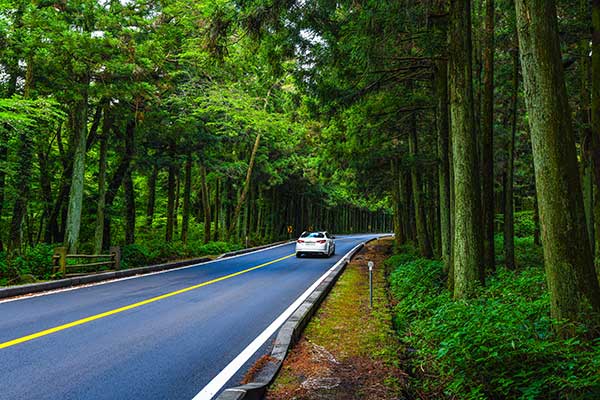 도로 양쪽 숲이 깊고 짙은 비자림로. 드라이브 코스로 인기가 좋다.