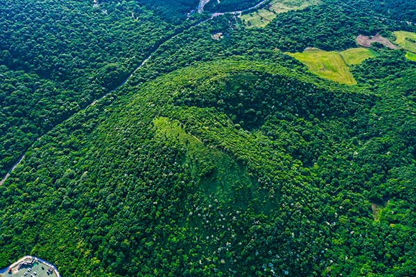 말굽형 굼부리를 가진 봉개동 민오름은 정상부 능선이 ‘V’ 형태로 발달했다. 가파른 사면을 올라 만나는 능선 삼거리에서 좌우 어디로 가도 되지만, 정상은 오른쪽이다. 통나무 벤치와 조망 설명판이 설치된 정상에서 남동쪽으로 시야가 훤히 트인다. 짙은 숲이 뒤덮은 절물오름과 한라산이 선명하고, 큰지그리오름도 잘 보인다. 발아래 펼쳐진 교래곶자왈과 사려니숲은 그대로 초록빛 바다 같다. 그 너머로 다랑쉬와 높은오름, 성불오름, 부대·부소오름, 영주산, 대록산 같은 동쪽 제주의 오름들이 펼쳐진다. 숲이 만든 바다에 떠 있는 섬 같다.